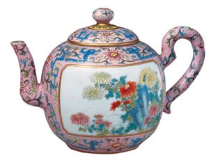 清乾隆粉地粉彩開光菊花紋茶壺,故宮博物院藏。