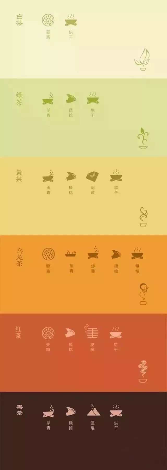 上圖是六大茶類的制作工藝,而事實上,六大茶類各有一道關鍵工序,這道關鍵工序是正是六大茶類分類的標準來源。
