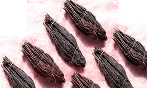 龍須茶具有工藝晶的性質(zhì),它對(duì)外形的要求極高,茶束的外觀形狀,必須滿像蘸墨汁而直立的短毛筆,色呈墨綠,長(zhǎng)約二寸八分,最大處周圓約二寸半,不宜過(guò)大或過(guò)小,四十至五十個(gè)干茶束約重一斤。茶束分單束和雙束兩種,均扎以鮮艷的紅、綠絲線。