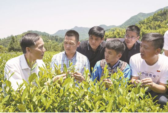 省級非遺傳承人李賢葆(左一)向朱遠志(左四)講授舒城小蘭花茶葉的種植、管理技術(shù)。張永攝