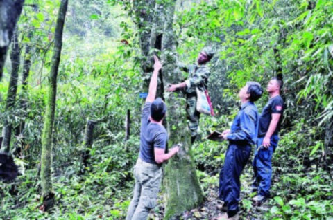 科研人員在考察西雙版納勐海大黑山古茶樹。 光明圖片