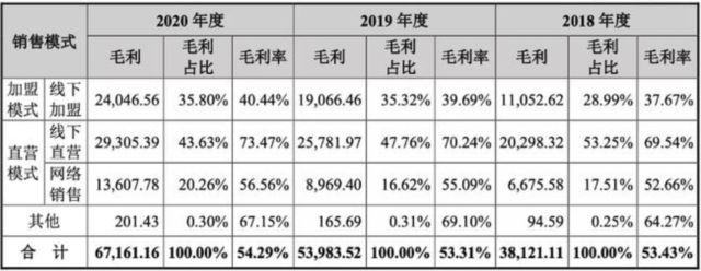 從銷售模式來看,八馬茶業(yè)采取的是“直營+加盟”、“線上+線下”的全渠道銷售體系。截至2020年末,公司門店數(shù)量超過2000家,其中直營店366家,加盟店超1700家。雖然,加盟店數(shù)量遠(yuǎn)超直營店數(shù)量,但由于線下加盟模式的毛利率只有40%,遠(yuǎn)低于線下直營模式73%的毛利率。因此,366家直營店貢獻(xiàn)的毛利與超過1700家加盟店貢獻(xiàn)的利潤大體相當(dāng)。