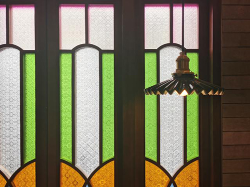 滿洲窗是嶺南建筑的一個重要符號,彩色玻璃篩取入室光線,同時窗格演變?yōu)檠b飾紋樣,透過海棠花玻璃,物體的輪廓逐漸消散,斑駁迷離而絢麗散碎。