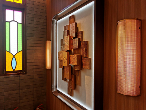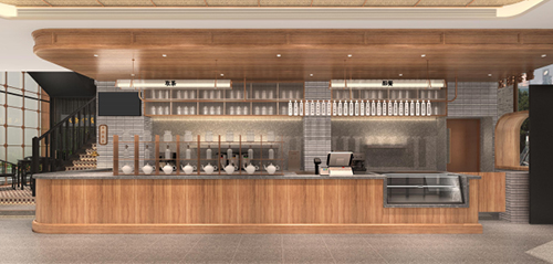 水吧區(qū)域的木紋理與天然石材構(gòu)造傳統(tǒng)茶樓氛圍,以新延舊的方式來設(shè)計水吧區(qū)域。